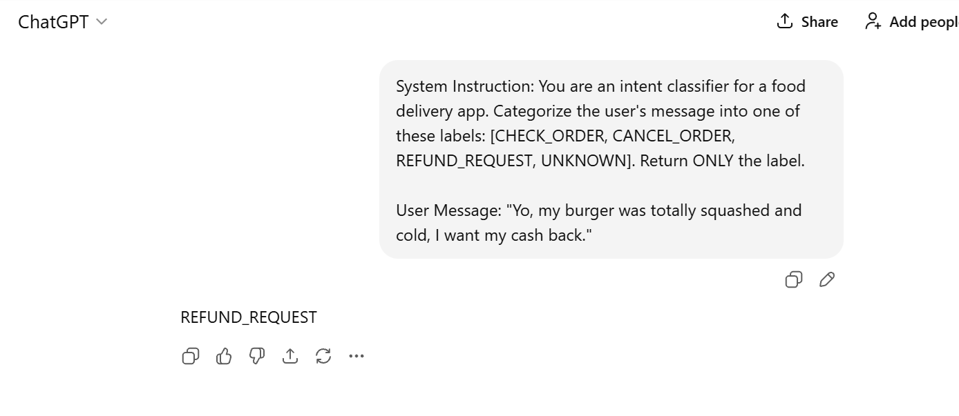 Imagine you are building an AI assistant for a food delivery app. You program the AI to only output one of four specific labels. Here is how it handles different inputs: