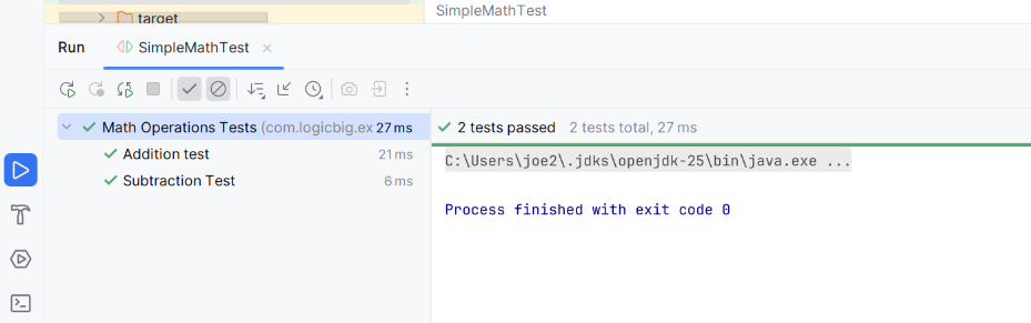 mvn test -Dtest=SimpleMathTest OutputD:\example-projects\junit-5\junit-5-test-display-name\junit-5-display-name-annotation>mvn test -Dtest=SimpleMathTest [INFO] Scanning for projects... [INFO] [INFO] --------< com.logicbig.example:junit-5-display-name-annotation >-------- [INFO] Building junit-5-display-name-annotation 1.0-SNAPSHOT [INFO] from pom.xml [INFO] --------------------------------[ jar ]--------------------------------- [INFO] [INFO] --- resources:3.3.1:resources (default-resources) @ junit-5-display-name-annotation --- [WARNING] Using platform encoding (UTF-8 actually) to copy filtered resources, i.e. build is platform dependent! [INFO] skip non existing resourceDirectory D:\example-projects\junit-5\junit-5-test-display-name\junit-5-display-name-annotation\src\main\resources [INFO] [INFO] --- compiler:3.14.1:compile (default-compile) @ junit-5-display-name-annotation --- [INFO] No sources to compile [INFO] [INFO] --- resources:3.3.1:testResources (default-testResources) @ junit-5-display-name-annotation --- [WARNING] Using platform encoding (UTF-8 actually) to copy filtered resources, i.e. build is platform dependent! [INFO] skip non existing resourceDirectory D:\example-projects\junit-5\junit-5-test-display-name\junit-5-display-name-annotation\src\test\resources [INFO] [INFO] --- compiler:3.14.1:testCompile (default-testCompile) @ junit-5-display-name-annotation --- [INFO] Nothing to compile - all classes are up to date. [INFO] [INFO] --- surefire:3.5.0:test (default-test) @ junit-5-display-name-annotation --- [INFO] Using auto detected provider org.apache.maven.surefire.junitplatform.JUnitPlatformProvider [INFO] [INFO] ------------------------------------------------------- [INFO] T E S T S [INFO] ------------------------------------------------------- [INFO] +--Math Operations Tests - 0.081 ss [INFO] | +-- [OK] Addition test - 0.039 ss [INFO] | '-- [OK] Subtraction Test - 0.013 ss [INFO] [INFO] Results: [INFO] [INFO] Tests run: 2, Failures: 0, Errors: 0, Skipped: 0 [INFO] [INFO] ------------------------------------------------------------------------ [INFO] BUILD SUCCESS [INFO] ------------------------------------------------------------------------ [INFO] Total time: 2.895 s [INFO] Finished at: 2025-12-02T17:54:48+08:00 [INFO] ------------------------------------------------------------------------