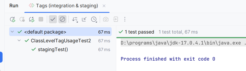 We explicitly applied @Tag("staging") to the stagingTest() method. This means the stagingTest() method now has two tags: 'integration' (inherited) and 'staging' (explicit).