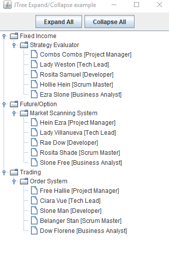 This example shows how to expand or collapse all nodes of a JTree programmatically. ExampleExpand/Collapse JTree nodespackage com.logicbig.example; import javax.swing.*; import javax.swing.tree.DefaultMutableTreeNode; import javax.swing.tree.TreePath; import java.util.ArrayList; import java.util.Collections; public class JTreeUtil { public static void setTreeExpandedState(JTree tree, boolean expanded) { DefaultMutableTreeNode node = (DefaultMutableTreeNode) tree.getModel().getRoot(); setNodeExpandedState(tree, node, expanded); } public static void setNodeExpandedState(JTree tree, DefaultMutableTreeNode node, boolean expanded) { ArrayList<DefaultMutableTreeNode> list = Collections.list(node.children()); for (DefaultMutableTreeNode treeNode : list) { setNodeExpandedState(tree, treeNode, expanded); } if (!expanded && node.isRoot()) { return; } TreePath path = new TreePath(node.getPath()); if (expanded) { tree.expandPath(path); } else { tree.collapsePath(path); } } } Creating JTreepublic class TreeExampleMain { public static void main(String[] args) { Hashtable<?, ?> projectHierarchyMap = TradingProjectDataService.instance.getProjectHierarchy(); JTree tree = new JTree(projectHierarchyMap); JFrame frame = createFrame(); frame.add(new JScrollPane(tree)); frame.add(createTopPanel(tree), BorderLayout.NORTH); frame.setLocationRelativeTo(null); frame.setVisible(true); } private static JComponent createTopPanel(JTree tree) { JPanel panel = new JPanel(); JButton expandBtn = new JButton("Expand All"); expandBtn.addActionListener(ae-> { JTreeUtil.setTreeExpandedState(tree, true); }); panel.add(expandBtn); JButton collapseBtn = new JButton("Collapse All"); collapseBtn.addActionListener(ae-> {JTreeUtil.setTreeExpandedState(tree, false);}); panel.add(collapseBtn); return panel; } private static JFrame createFrame() { JFrame frame = new JFrame("JTree Expand/Collapse example"); frame.setDefaultCloseOperation(JFrame.EXIT_ON_CLOSE); frame.setSize(new Dimension(500, 400)); return frame; } } Output![]() On clicking 'Expand All' button: ![]() Example ProjectDependencies and Technologies Used: