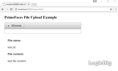<h:body style="margin-left:30px"> <h2>PrimeFaces File Upload Example</h2> <h:form> <p:fileUpload update="content" auto="true" style="width:500px;" fileUploadListener="#{fileUploadBean.handleUpload}"/> <p:panel id="content" style="border:none;"> <p:outputPanel rendered="#{fileUploadBean.fileName ne null}"> <h4>File name:</h4> #{fileUploadBean.fileName} <h4>File content:</h4> #{fileUploadBean.fileContent} </p:outputPanel> </p:panel> </h:form> </h:body>