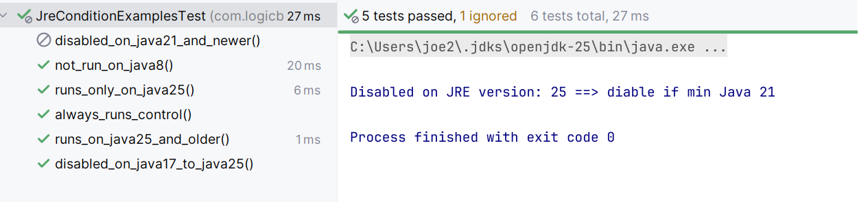 mvn test -Dtest=JreConditionExamplesTest OutputD:\example-projects\junit-5\junit-5-enabling-disabling-tests\junit-5-enabled-disabled-for-jre>mvn test -Dtest=JreConditionExamplesTest [INFO] Scanning for projects... [INFO] [INFO] -------< com.logicbig.example:junit-5-enabled-disabled-for-jre >-------- [INFO] Building junit-5-enabled-disabled-for-jre 1.0-SNAPSHOT [INFO] from pom.xml [INFO] --------------------------------[ jar ]--------------------------------- [INFO] [INFO] --- resources:3.3.1:resources (default-resources) @ junit-5-enabled-disabled-for-jre --- [WARNING] Using platform encoding (UTF-8 actually) to copy filtered resources, i.e. build is platform dependent! [INFO] skip non existing resourceDirectory D:\example-projects\junit-5\junit-5-enabling-disabling-tests\junit-5-enabled-disabled-for-jre\src\main\resources [INFO] [INFO] --- compiler:3.14.1:compile (default-compile) @ junit-5-enabled-disabled-for-jre --- [INFO] No sources to compile [INFO] [INFO] --- resources:3.3.1:testResources (default-testResources) @ junit-5-enabled-disabled-for-jre --- [WARNING] Using platform encoding (UTF-8 actually) to copy filtered resources, i.e. build is platform dependent! [INFO] skip non existing resourceDirectory D:\example-projects\junit-5\junit-5-enabling-disabling-tests\junit-5-enabled-disabled-for-jre\src\test\resources [INFO] [INFO] --- compiler:3.14.1:testCompile (default-testCompile) @ junit-5-enabled-disabled-for-jre --- [INFO] Nothing to compile - all classes are up to date. [INFO] [INFO] --- surefire:3.5.0:test (default-test) @ junit-5-enabled-disabled-for-jre --- [INFO] Using auto detected provider org.apache.maven.surefire.junitplatform.JUnitPlatformProvider [INFO] [INFO] ------------------------------------------------------- [INFO] T E S T S [INFO] ------------------------------------------------------- [INFO] +--com.logicbig.example.JreConditionExamplesTest - 0.085 ss [INFO] | +-- [??] disabled_on_java21_and_newer (Disabled on JRE version: 25 ==> diable if min Java 21) - 0 ss [INFO] | +-- [OK] not_run_on_java8 - 0.032 ss [INFO] | +-- [OK] runs_only_on_java25 - 0 ss [INFO] | +-- [OK] always_runs_control - 0 ss [INFO] | +-- [OK] runs_on_java25_and_older - 0 ss [INFO] | '-- [OK] disabled_on_java17_to_java25 - 0 ss [INFO] [INFO] Results: [INFO] [WARNING] Tests run: 6, Failures: 0, Errors: 0, Skipped: 1 [INFO] [INFO] ------------------------------------------------------------------------ [INFO] BUILD SUCCESS [INFO] ------------------------------------------------------------------------ [INFO] Total time: 2.817 s [INFO] Finished at: 2025-12-04T07:09:30+08:00 [INFO] ------------------------------------------------------------------------