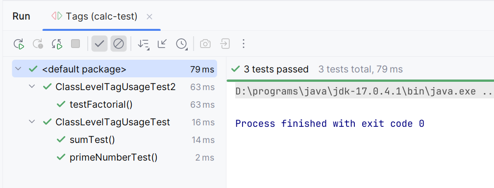 As seen above, the tag expression "calc-test" executed three methods: primeNumberTest(), sumTest(), and testFactorial(), as the first two inherit the tag from ClassLevelTagUsageTest and the last has the tag explicitly defined in ClassLevelTagUsageTest2.